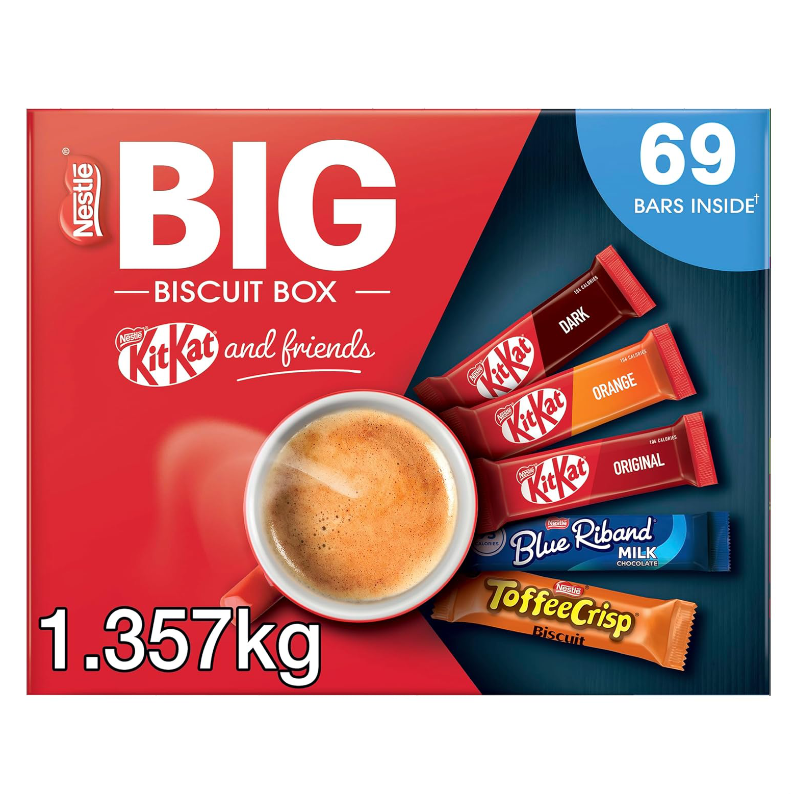 Our NEW Kitkat and Friends Big Biscuit Box is a display-ready presentation box featuring 69 Biscuit Bars across an assortment of 5 flavours: KitKat® 2 Finger Original Milk Chocolate, KitKat® 2 Finger Orange Milk Chocolate, KitKat® 2 Finger Dark, Blue Riband® Milk Chocolate and Toffee Crisp® Milk Chocolate Biscuit. Whether you’re stocking up the office biscuit drawer or treating your friends or family to a better break, our Big Biscuit Box is free from artificial colours, flavours, preservatives. KitKat® have been making breaks delicious since 1935 with tasty chocolate, and the secret to our perfect chocolate-to-wafer ratio. Now, with the Big Biscuit Box you can liven up any gathering by bringing an assortment of biscuits to share amongst colleagues and friends.